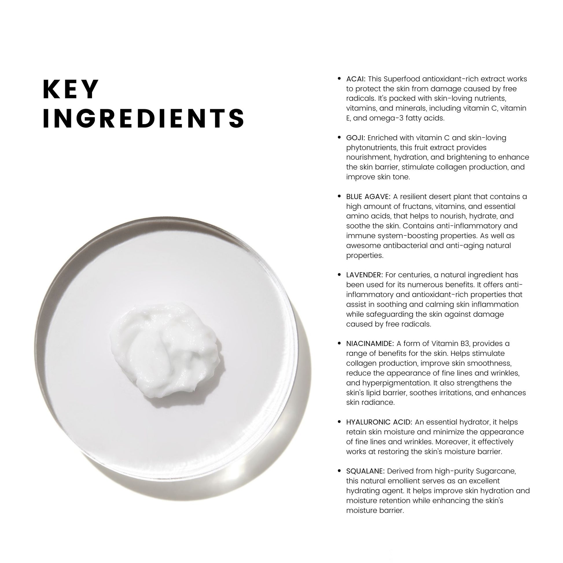 A dual-function overnight mask that's both a rich night cream and a revitalizing treatment for brighter, more radiant-looking skin. Enriched with Superfood antioxidants, vitamins, and minerals, plus three well-known active essentials like moisture-boosting Hyaluronic Acid + Squalane, and multi-active Niacinamide that help to deeply hydrate, nourish, and recover the skin. Lavender adds a calming, relaxing sensation while overall ingredients help target troubled skin for a healthier-looking complexion. Ideal for maintaining revitalized skin for all skin types, dullness, and uneven skin tone.